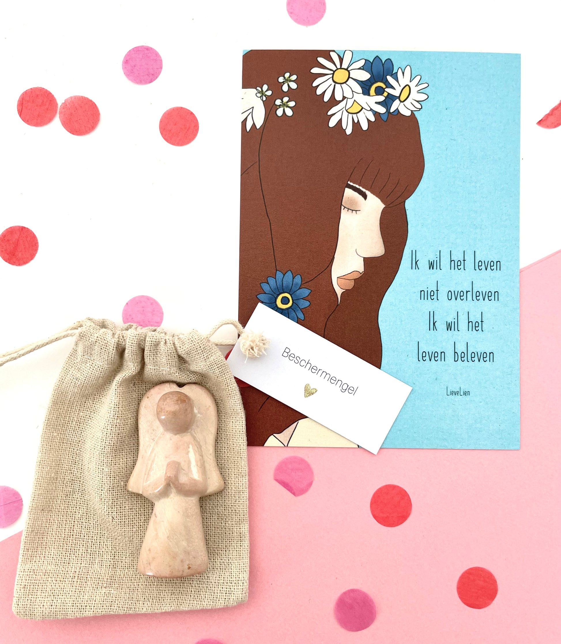 Deze cadeauset bestaat uit een liefdevol kaartje en een beschermengel van speksteen in een linnen zakje. Een klein symbool van kracht, zachtheid en bescherming. Om bij je te houden of door te geven aan iemand die het nodig heeft.