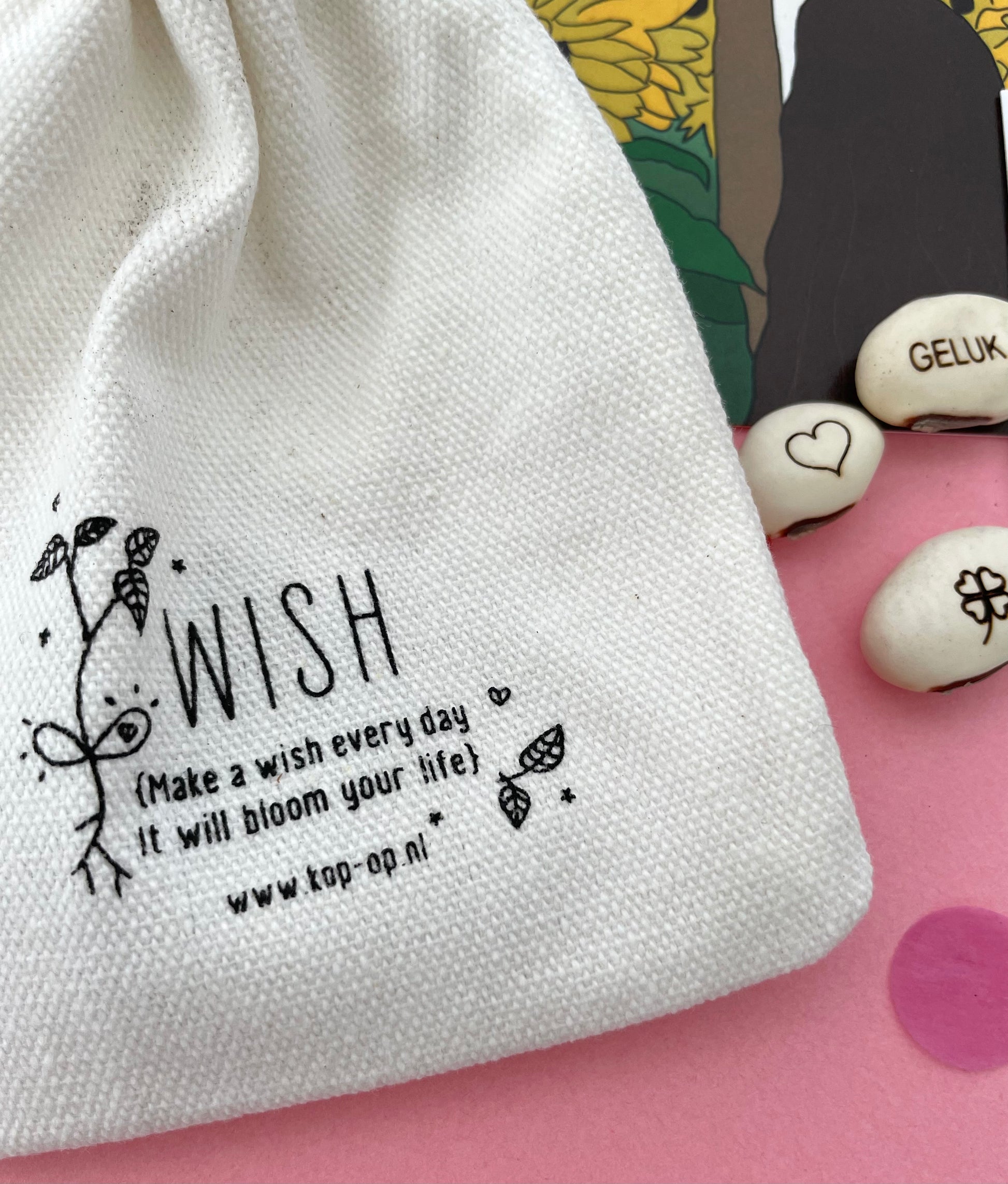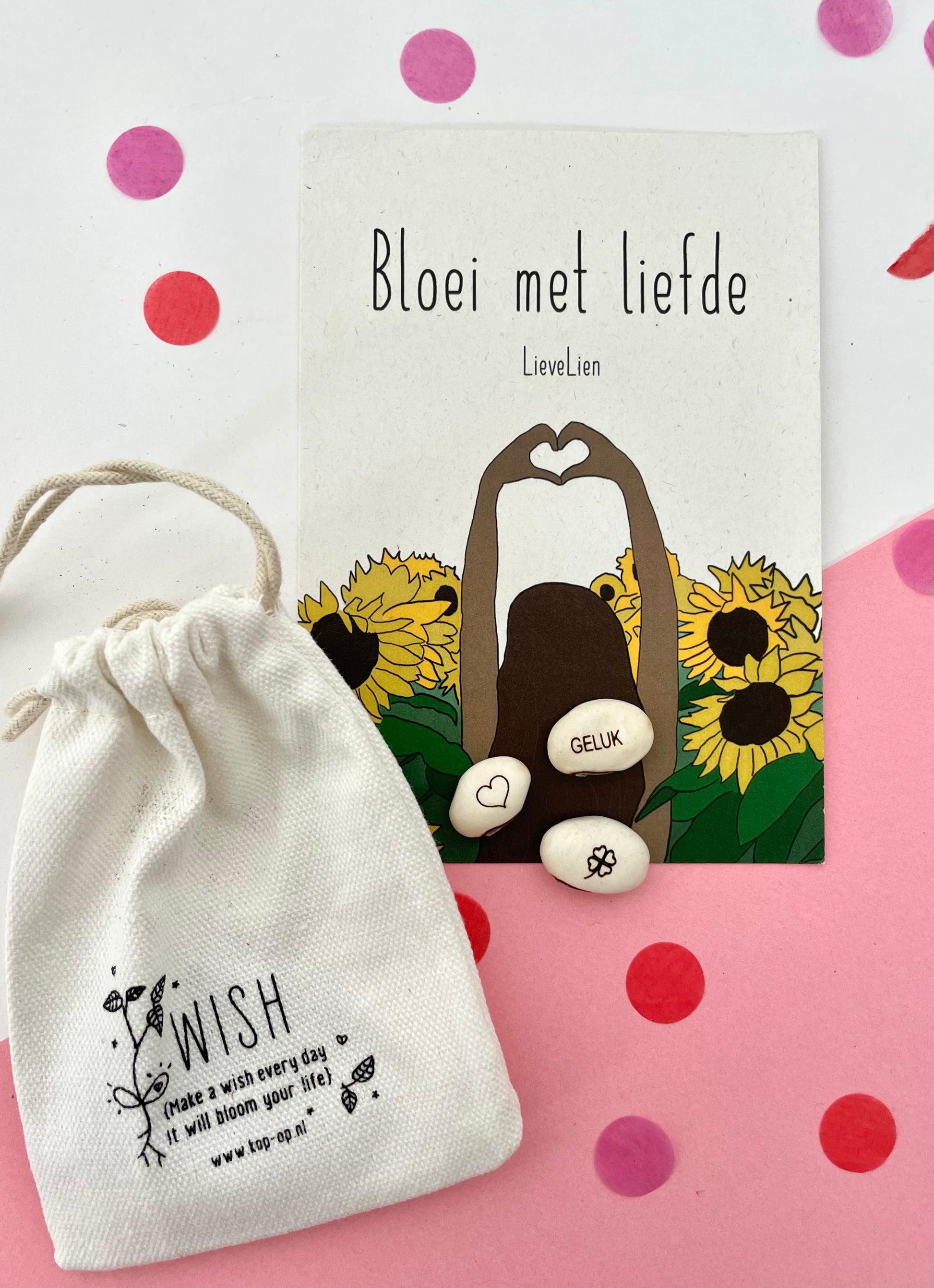 Deze cadeauset bevat een liefdevol kaartje en drie wensbonen in een zakje. Plant ze in de aarde en laat je wens langzaam tot bloei komen. Een klein gebaar dat laat zien dat groei tijd mag kosten.