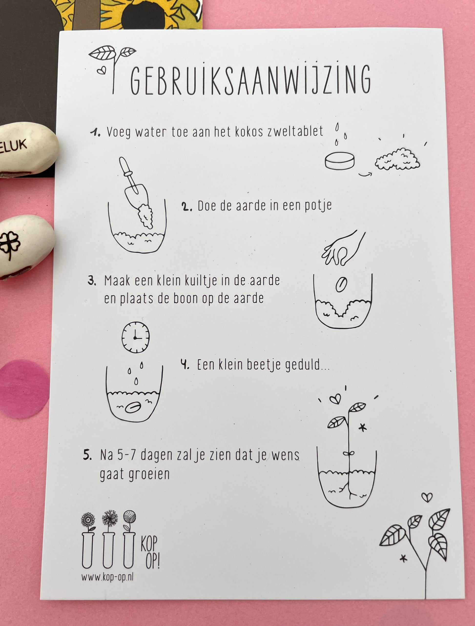 Voeg water toe aan het kokos aardetablet en doe de aarde in een potje. Maak een goed kuiltje, leg de wensboon erin en geef om de paar dagen een beetje water. Binnen een week zie je al de eerste sprietjes verschijnen. Op de het blaadje staat de tekst van je wens.