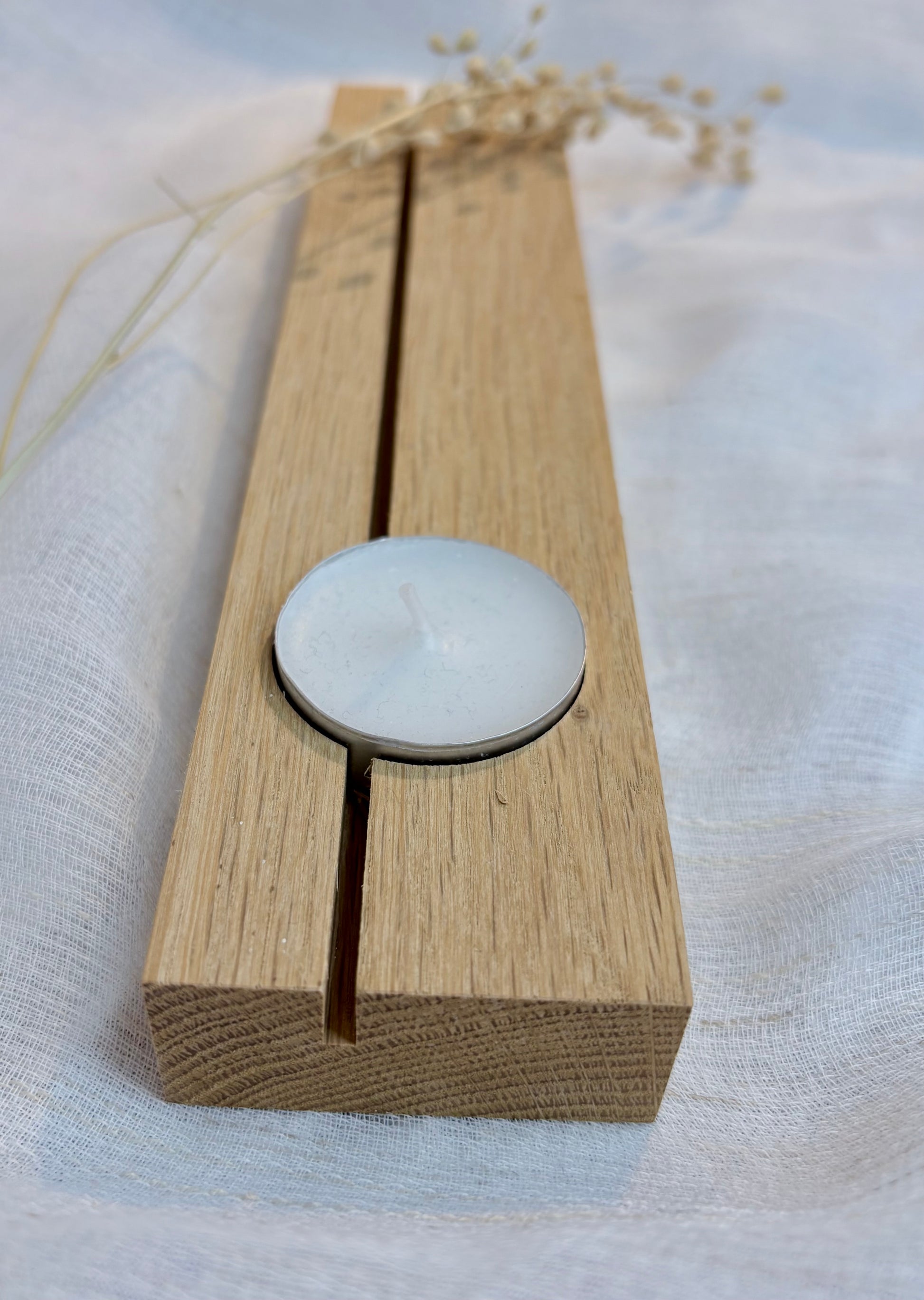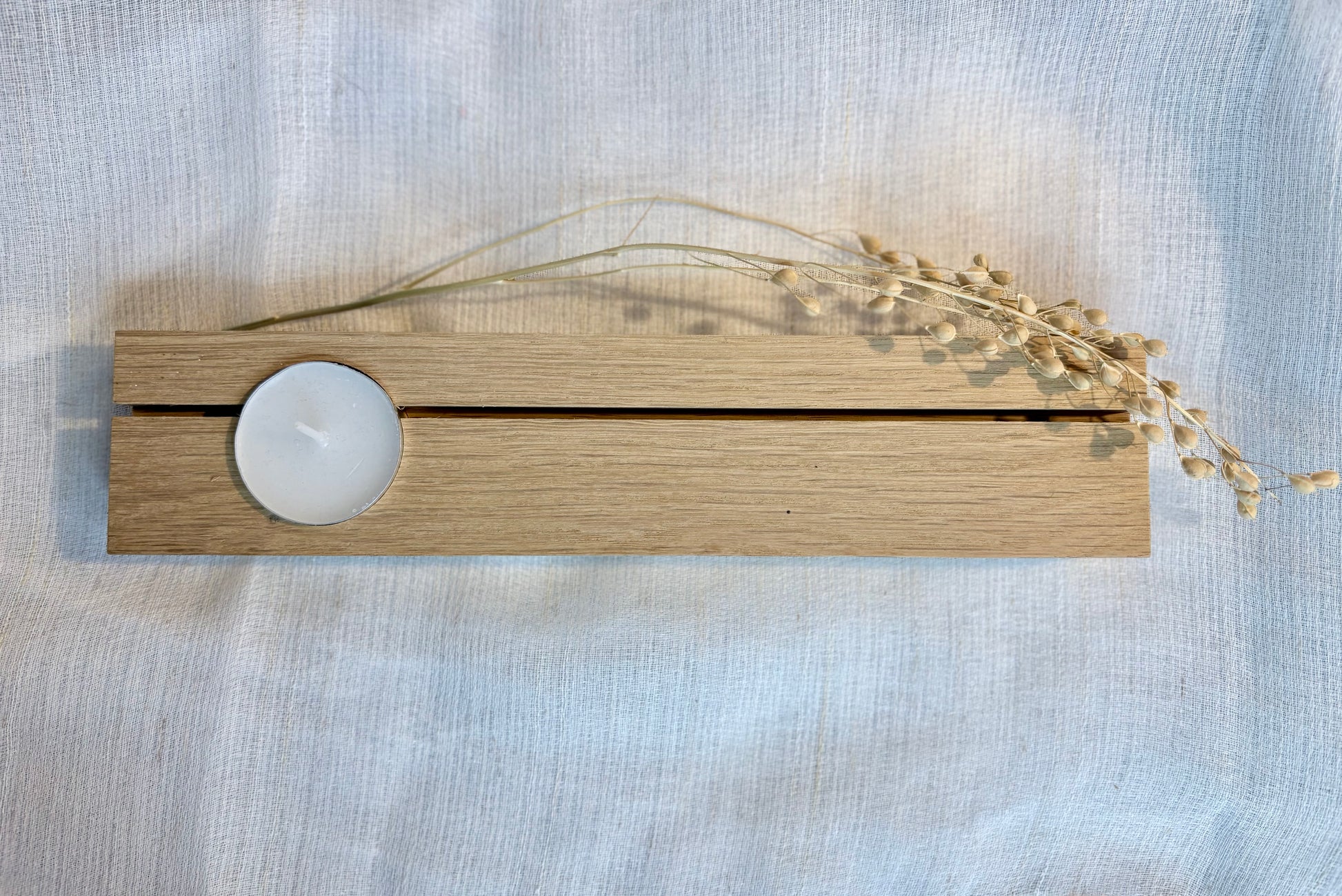 Een eenvoudige houten kaarthouder met plek voor een kaartje én een waxinelichtje.