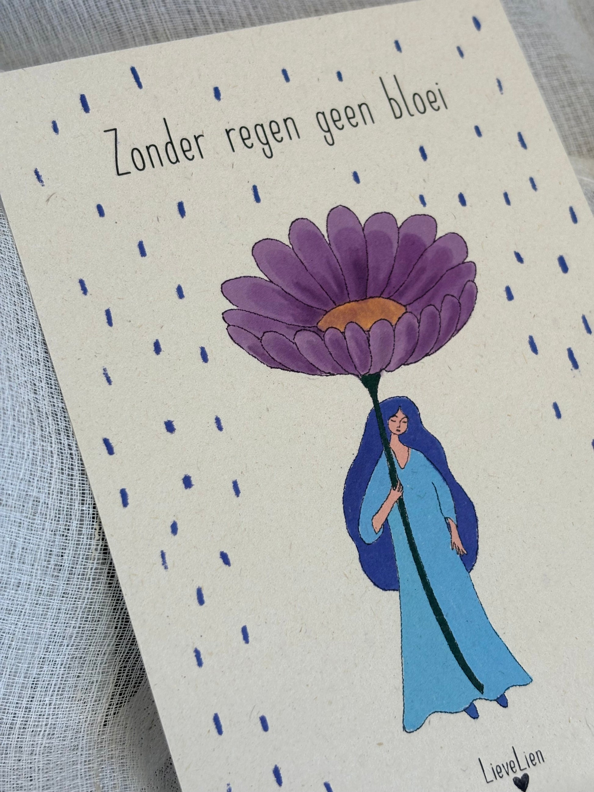Dit kaartje is er voor wie door de regen gaat — als herinnering dat ook daar bloei uit kan ontstaan.